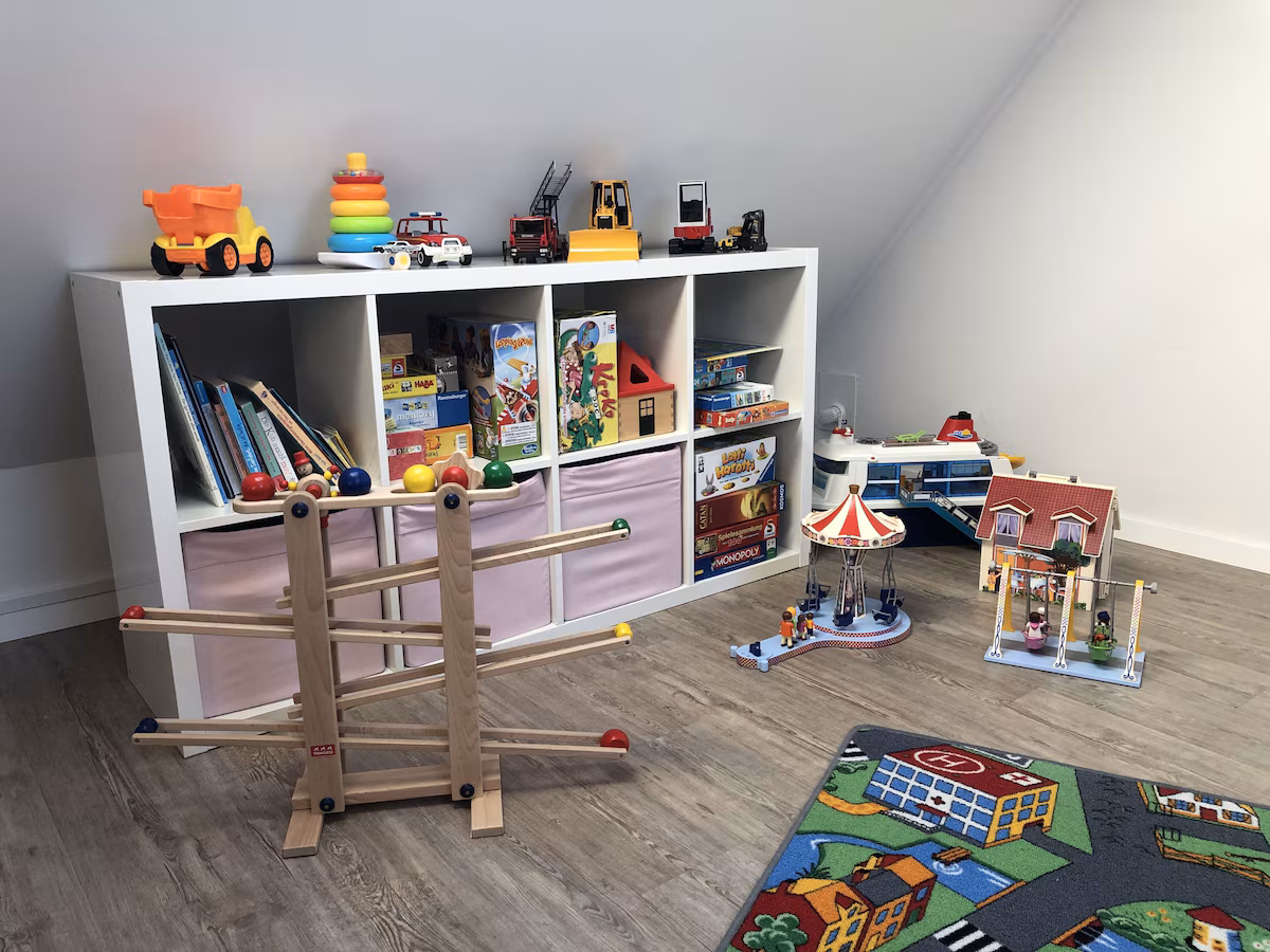 Die Wohnung ist sehr kinderfreundlich ausgestattet. Hochstuhl, Kinderbett, Wickelauflage, Babybadewanne, Fläschchenwärmer, Toilettensitz, Töpfchen, Waschhocker sowie ein Spielzimmer mit Spielteppich, diversen Spielsachen (Playmobil Zirkus, Holzeisenbahn, Puzzle, Spielesammlung, Uno-Junior uvm.), Büchern, CDs und DVDs ist vorhanden.
