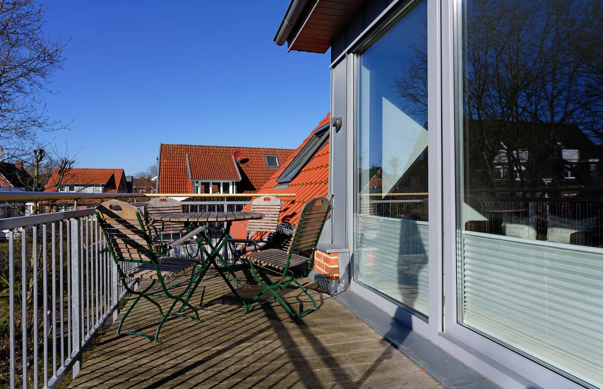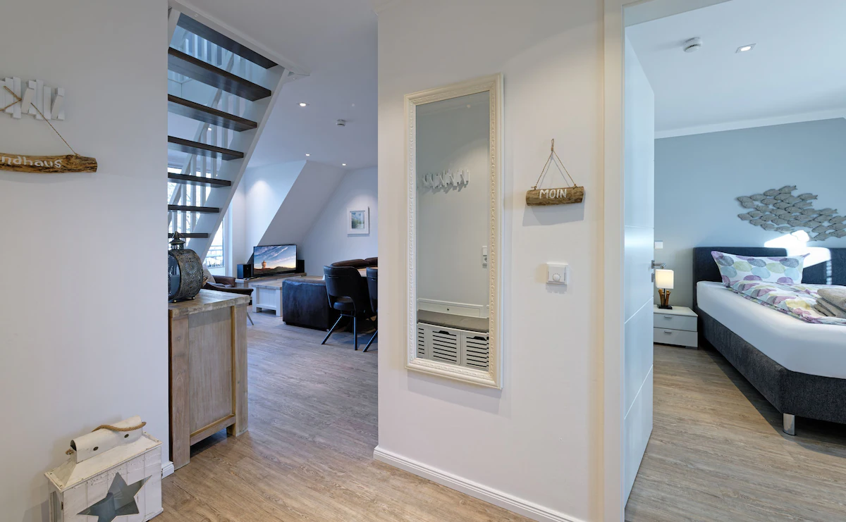Die Wohnung verfügt über zwei Schlafzimmer. Ein Schlafzimmer mit Doppelbett (Boxspringbett). Ein weiteres Schlafzimmer mit zwei Einzelbetten. Im Schlafzimmer mit Boxspringbett befindet sich ein Fernseher. Das Bad ist mit Dusche, WC, Waschbecken, Fön, Radio und einem Handtuchheizkörper ausgestattet. Auf der großen sonnigen Dachterrasse befinden sich eine Sitzgruppe mit Sonnenschirm und ein Strandkorb, um die Sonne zu genießen. Eine Waschmaschine und ein Trockner stehen selbstverständlich in der Wohnung bereit. Die Wohnung ist mit hochwertigem Vinylboden in Fichte-Optik bzw. im Bad mit Fliesen ausgestattet. Die gesamte Wohnung wird über angenehme Fußbodenheizung erwärmt.